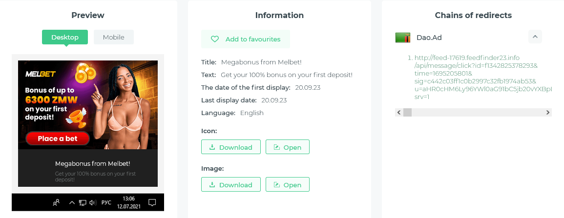 – Which landing pages advertisers use for promotion. After the system displays search results, simply click on the creative you’re interested in, and the service will provide a link to the landing page.