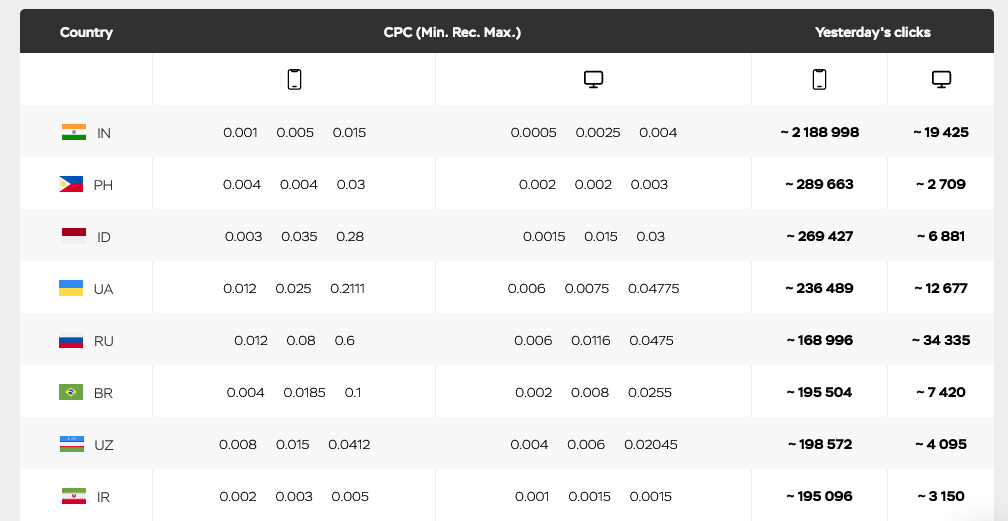 Each country has a wide range of distinctive features. Depending on these, the average cost of traffic in a specific region may differ from the market average or the maximum in another country.