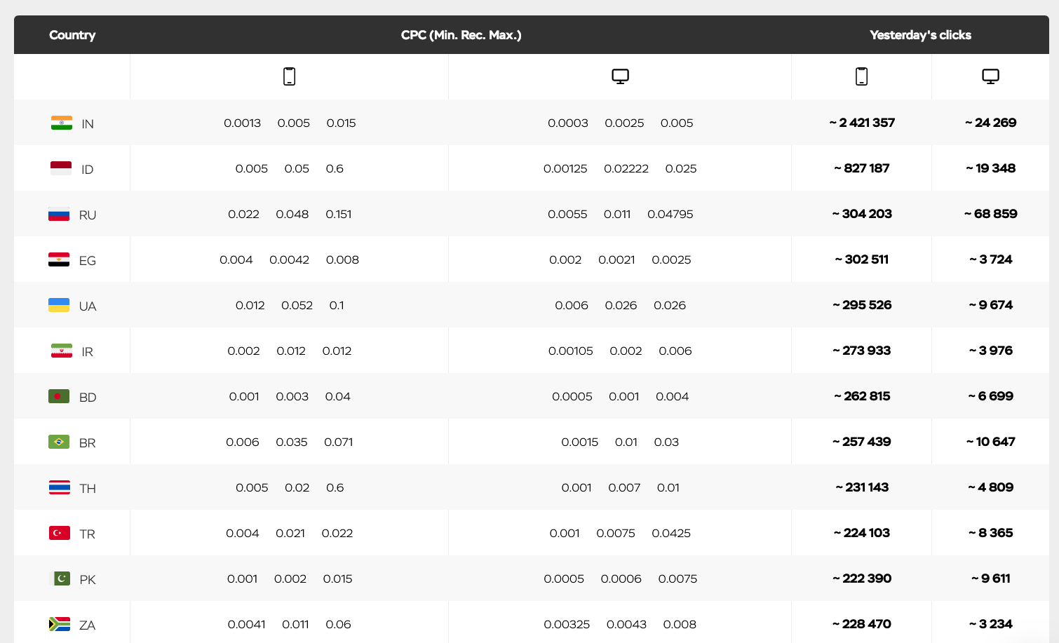 The right part of the table includes general information on clicks from GEOs in the last 24 hours. The data is updated every 24 hours and includes two categories: mobile devices and desktops.