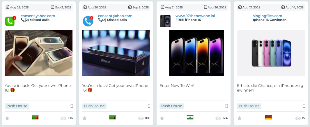 Для свипстейков Web Push хорош тем, что вы можете динамически адаптировать текст под ГЕО через макросы (например, {CITY}, {COUNTRY} заменяется на местные данные). Но ключ к успеху – яркий и цепляющий креатив. Так как push-уведомление само по себе является рекламным блоком, важно сразу в заголовке и описании заинтриговать пользователя (обещать «приз» или «подарок»), а изображение должно подчеркивать выгоду (например, фото смартфона, подарочной коробки или бонусов).